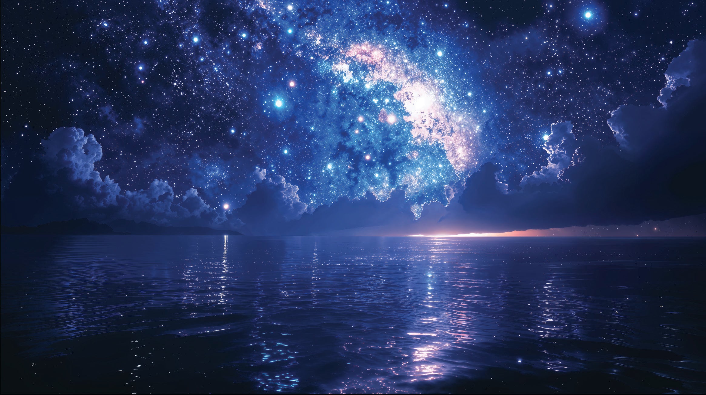 Beneath a canopy of cosmic wonder, a solitary sailboat glides across waves kissed by starlight. The sky, a tapestry of galactic hues, mirrors the moonlit sea below. As celestial clouds part, the moon guides this stellar voyage, painting a dreamscape where the ocean meets the stars in a dance of eternal beauty.